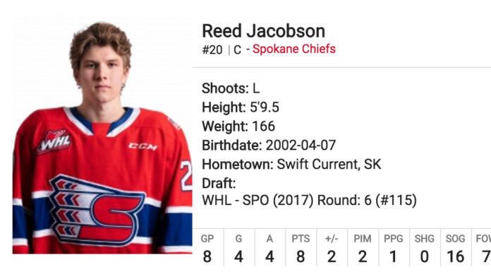 The second-year forward finished with two goals and two assists for his first four-point outing in the Western Hockey League. Jacobson scored in the second period to give the Spokane Chiefs a 3-1 lead and then scored on the power play in...