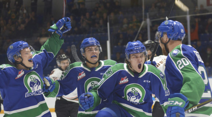 The Swift Current Broncos opened the 2019-20 Western Hockey League regular season with a dramatic 3-2 overtime win over the Calgary Hitmen on Saturday.