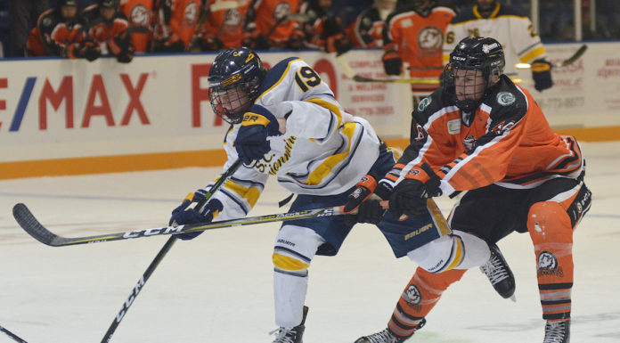 Jacob Herman backstopped the Broncos with 29 saves on 32 shots. John Priela and Colt Kornfeld led the attack with a goal and three...
