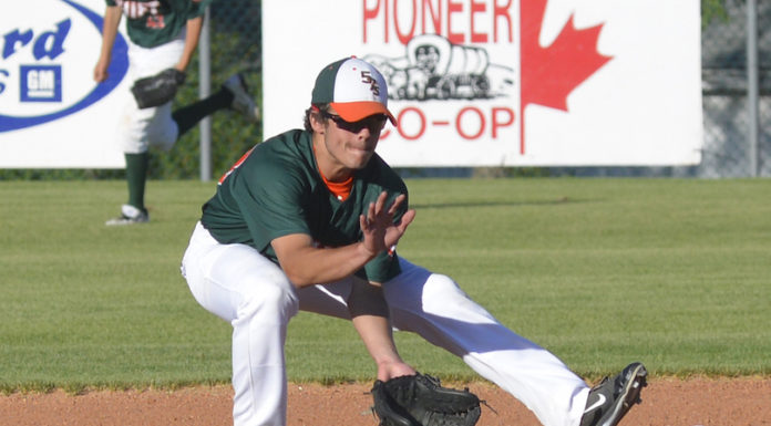 First baseman Kyle MacDonald made a spectacular return to the Swift Current 57’s, leading the team to a 10-1 win over the visiting Yorktown Cardinals Monday.