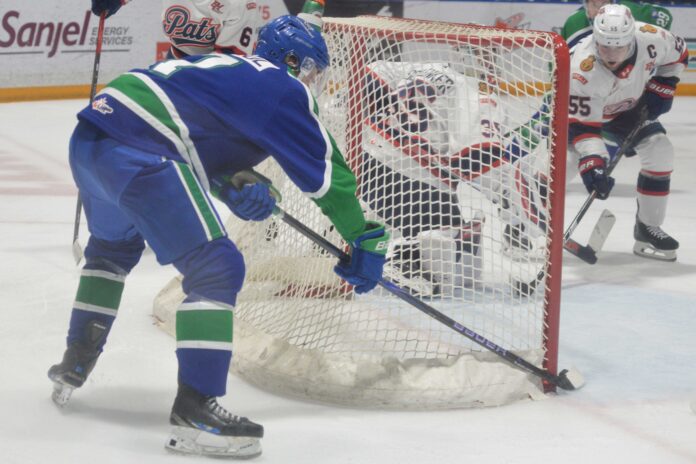 The Pats tied the game again in the second period with a Zach Moore goal and then took the lead with a power play goal from Ruslan Karimov on a screened point shot.